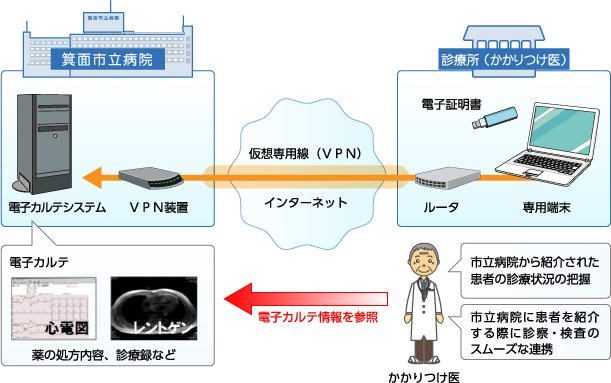 地域医療ネットワークシステムとは、インターネットを活用して、地域の医療機関(かかりつけ医)が市立病院に保存されている患者さまの診療に関する情報を参照するシステムのことです。