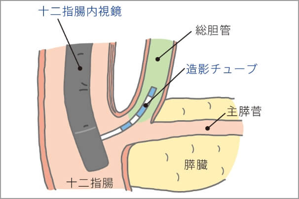 膵臓・胆道では内視鏡的逆行性胆膵管造影法(Endoscopic retrograde cholangiopancreatography:ERCP)というX線検査などを組み合わせた方法が行われます。十二指腸までスコープを進め、その先は内視鏡の先端から造影カテーテルという細いチューブを膵管胆管に挿入して、造影剤を直接注入しX線像を撮るのです。