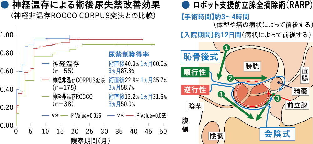 • 主に限局性前立腺癌に対して、この術式が採用されます。前立腺の側方にある神経血管束を温存する術式(神経温存)や前立腺や周囲のリンパ節を拡大して切除する術式(拡大切除・拡大リンパ節郭清)もあります。 術前尿漏れを防いできた前立腺が手術によってなくなるため、術後尿失禁をきたします。当科のデータでは多くの方が術後早期に改善されておられます。また神経血管束を温存することで、より早期に尿漏れが解消される傾向にあります。 ただし神経温存により前立腺癌の取り残しが発生する可能性もあり、適応は慎重に決定しています。誰にでも適応されるとは限りません。