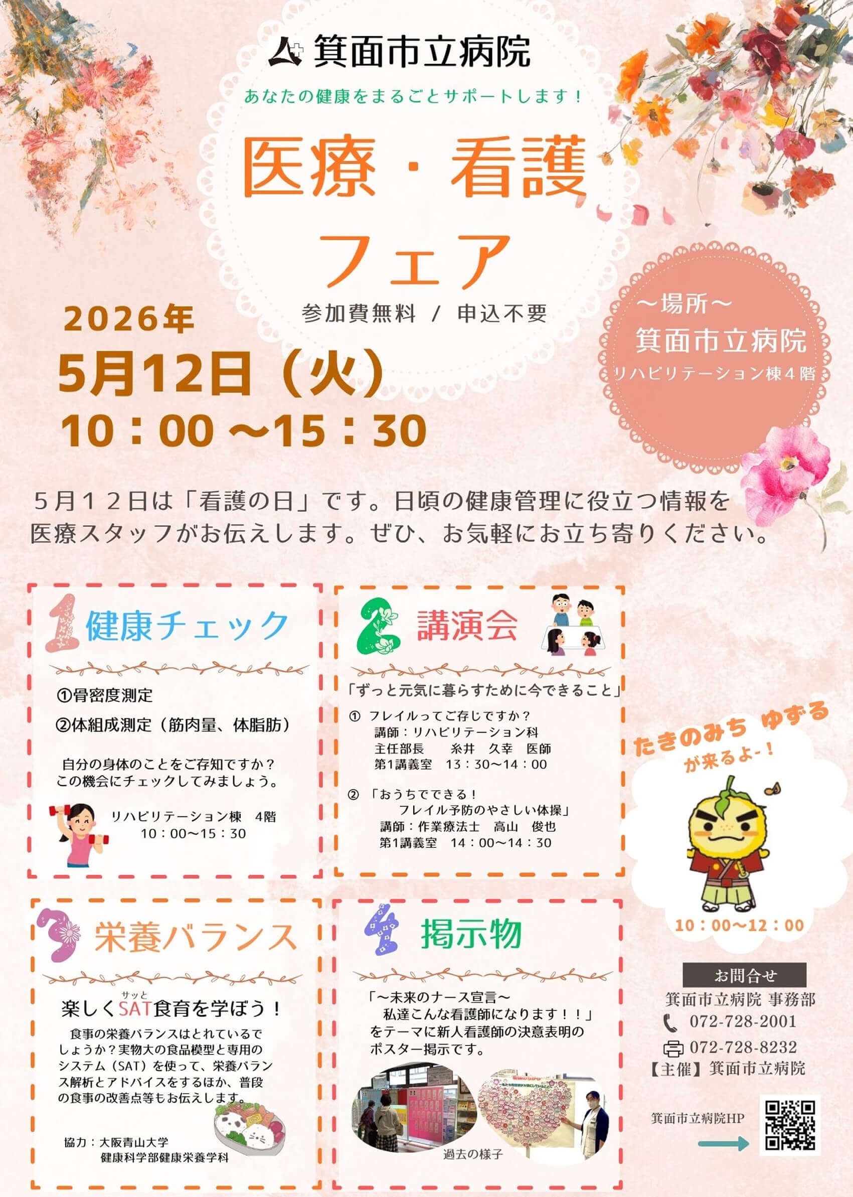 市立病院では、5⽉12⽇の「看護の⽇」にちなみ、「医療・看護フェア」を開催し、健康管理や医療・看護に関する情報を提供します。